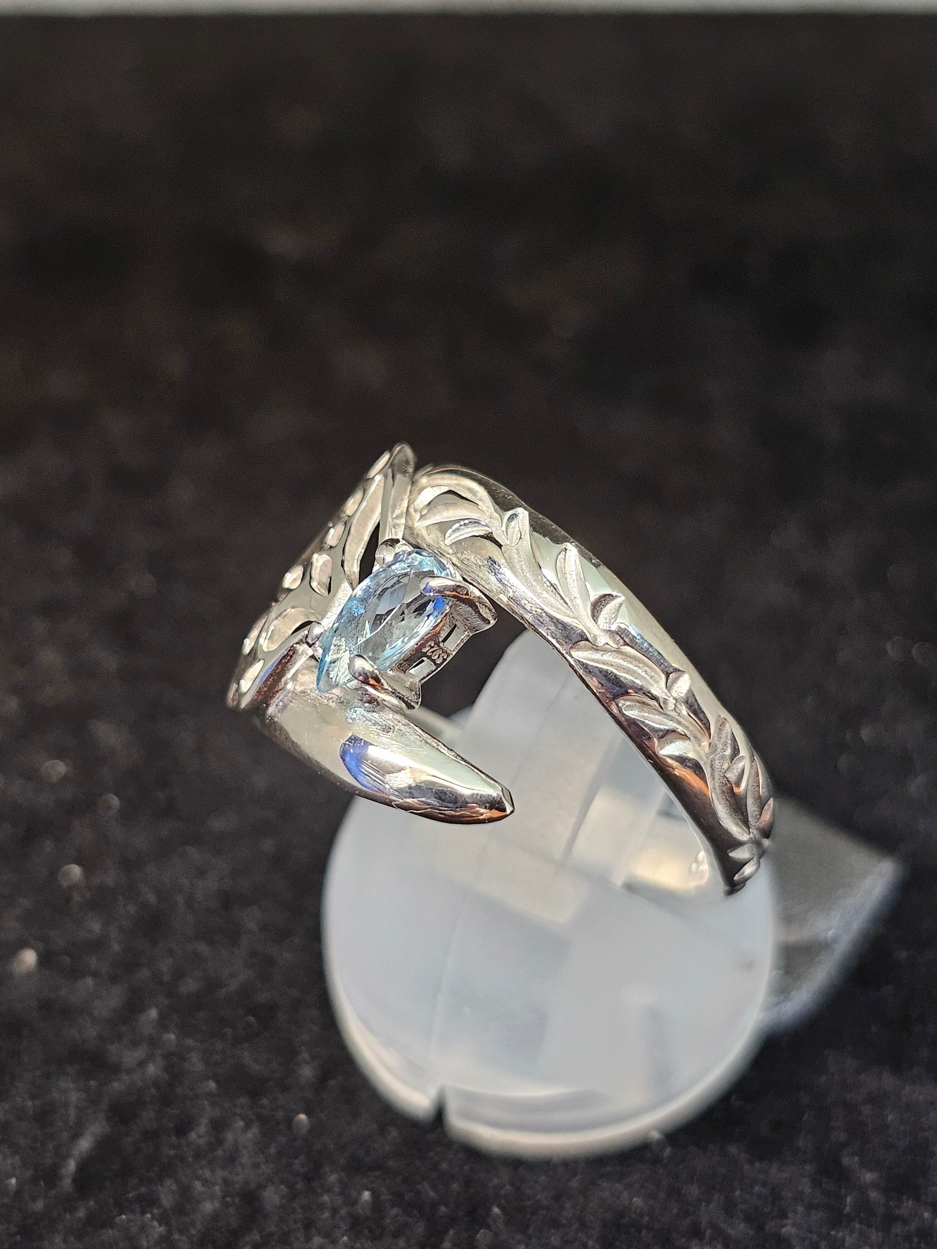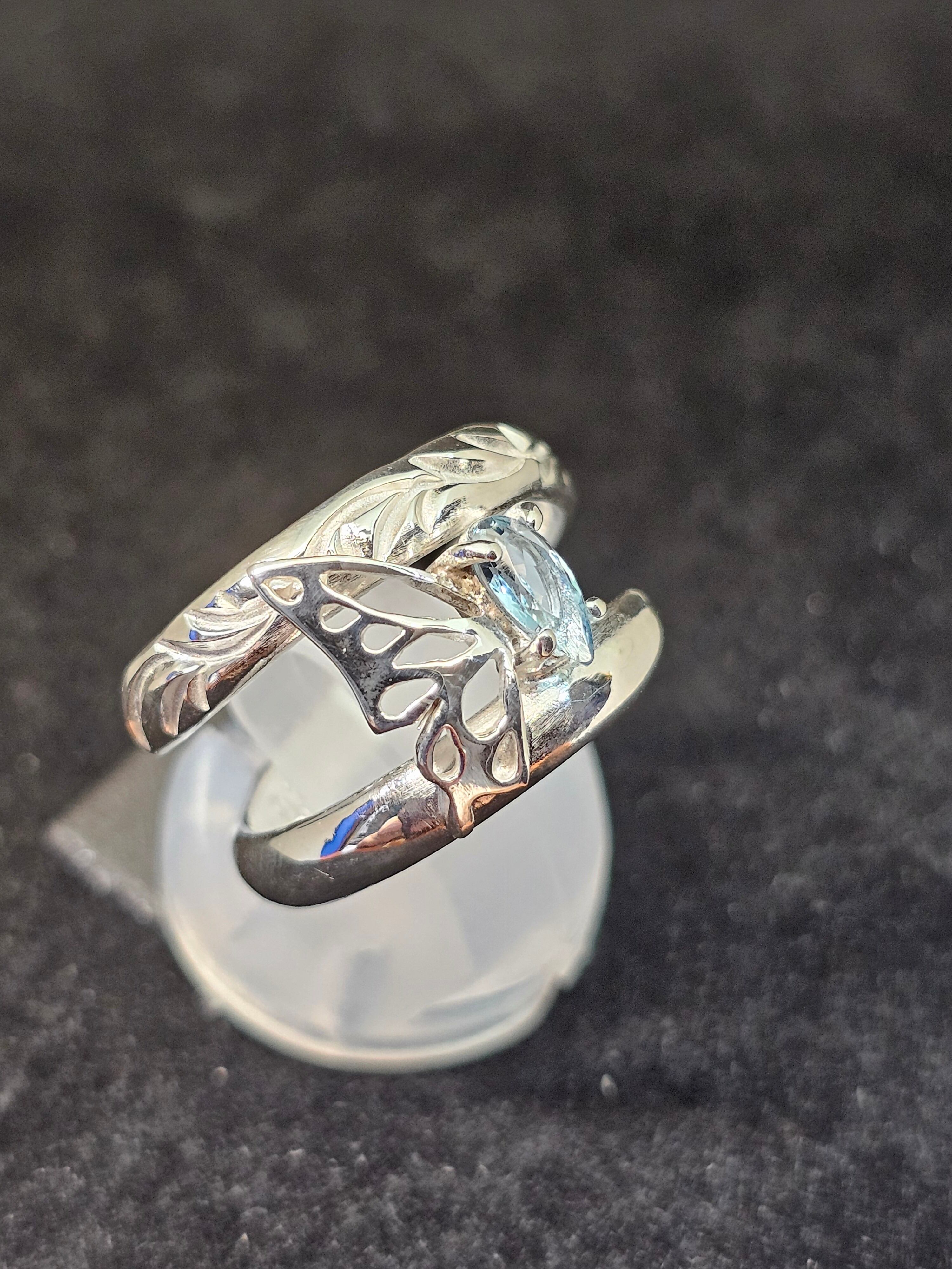 宝石と片翅蝶の指輪 天然アクワマリン7mm×3.8mm