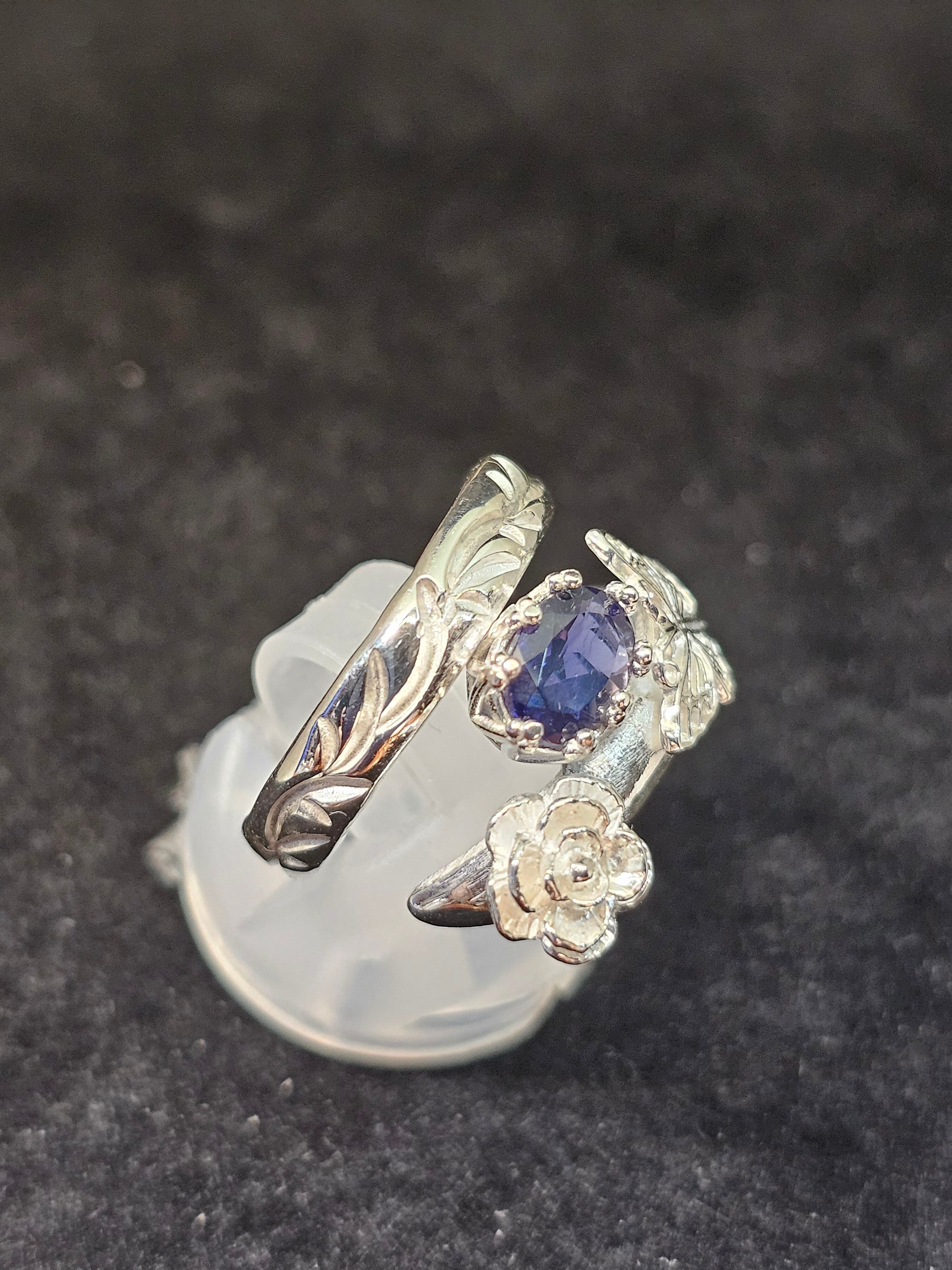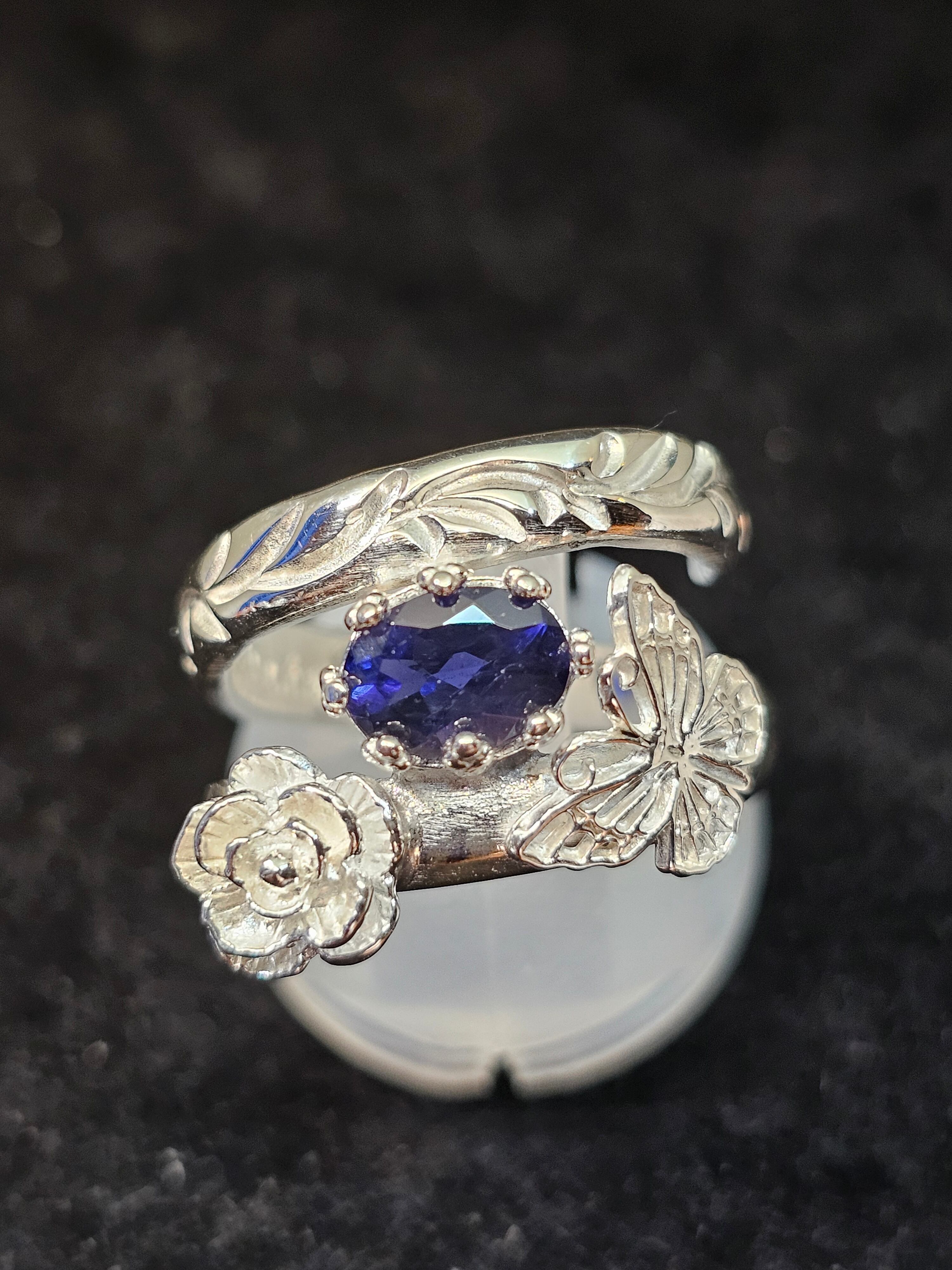 薔薇と蝶と宝石の指輪 マダガスカル産アイオライト7×5mm