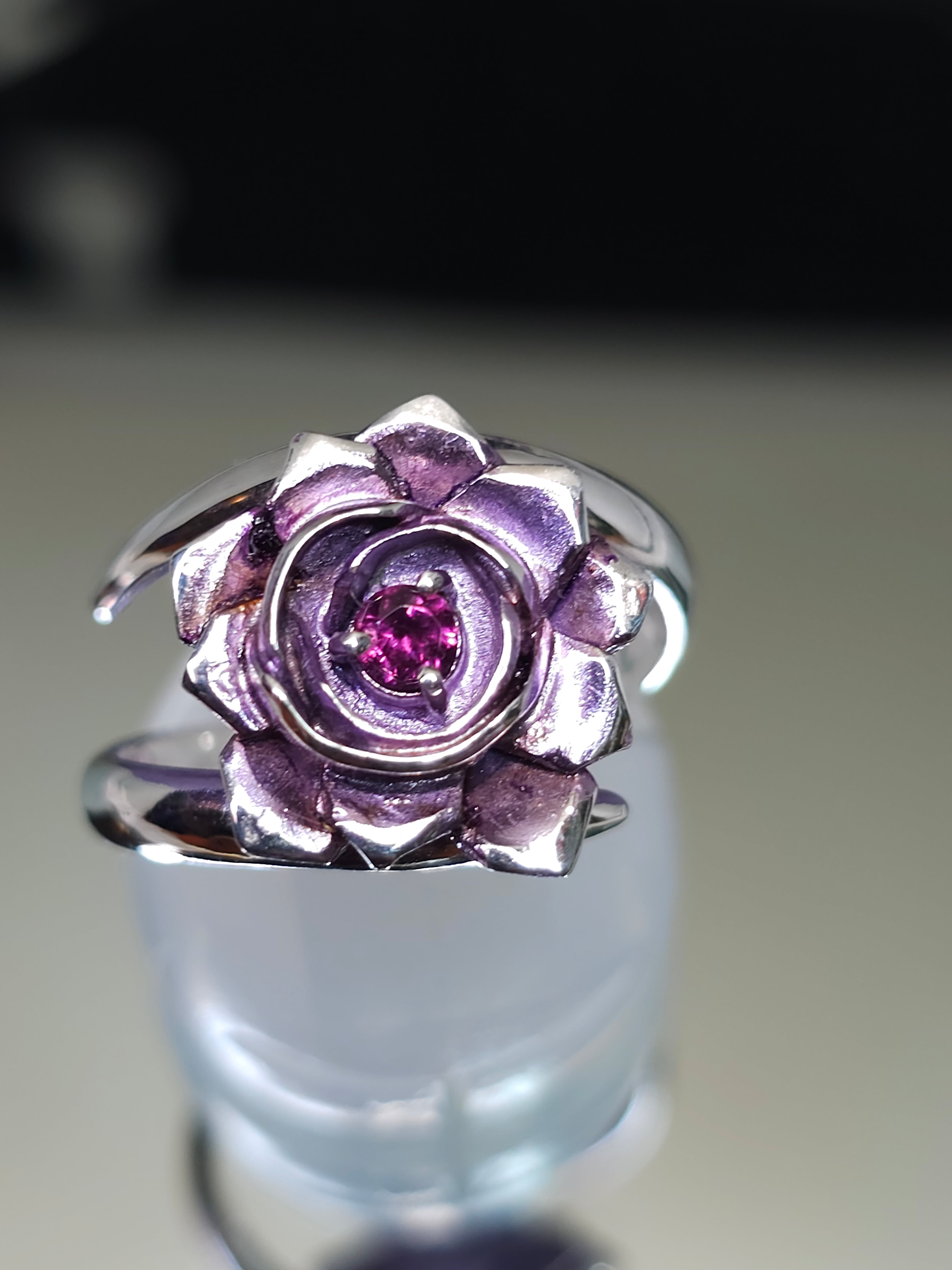 エレカラのヴァイオレットを半コーティングした、可愛らしいミニチュアローズの指輪です。