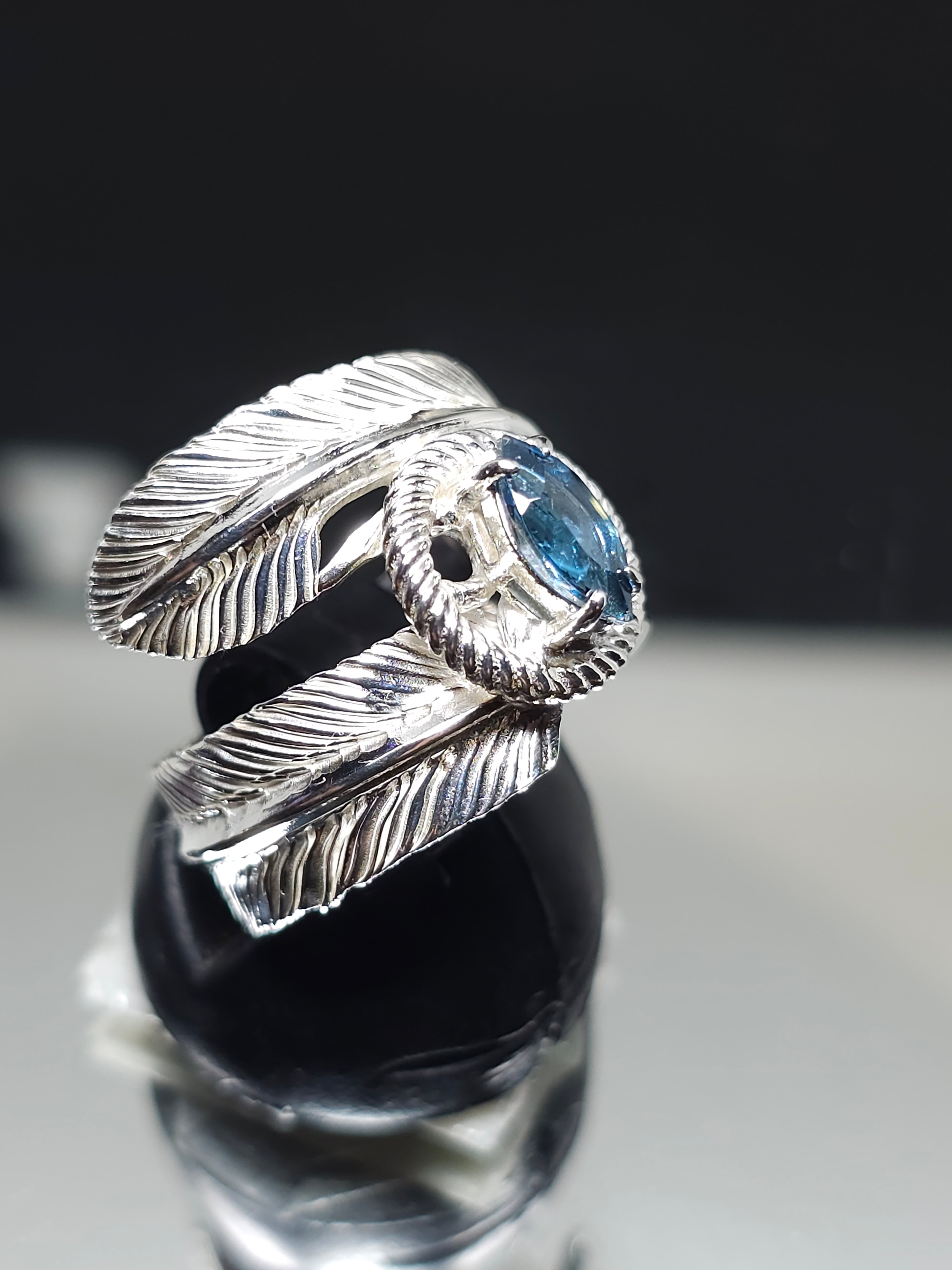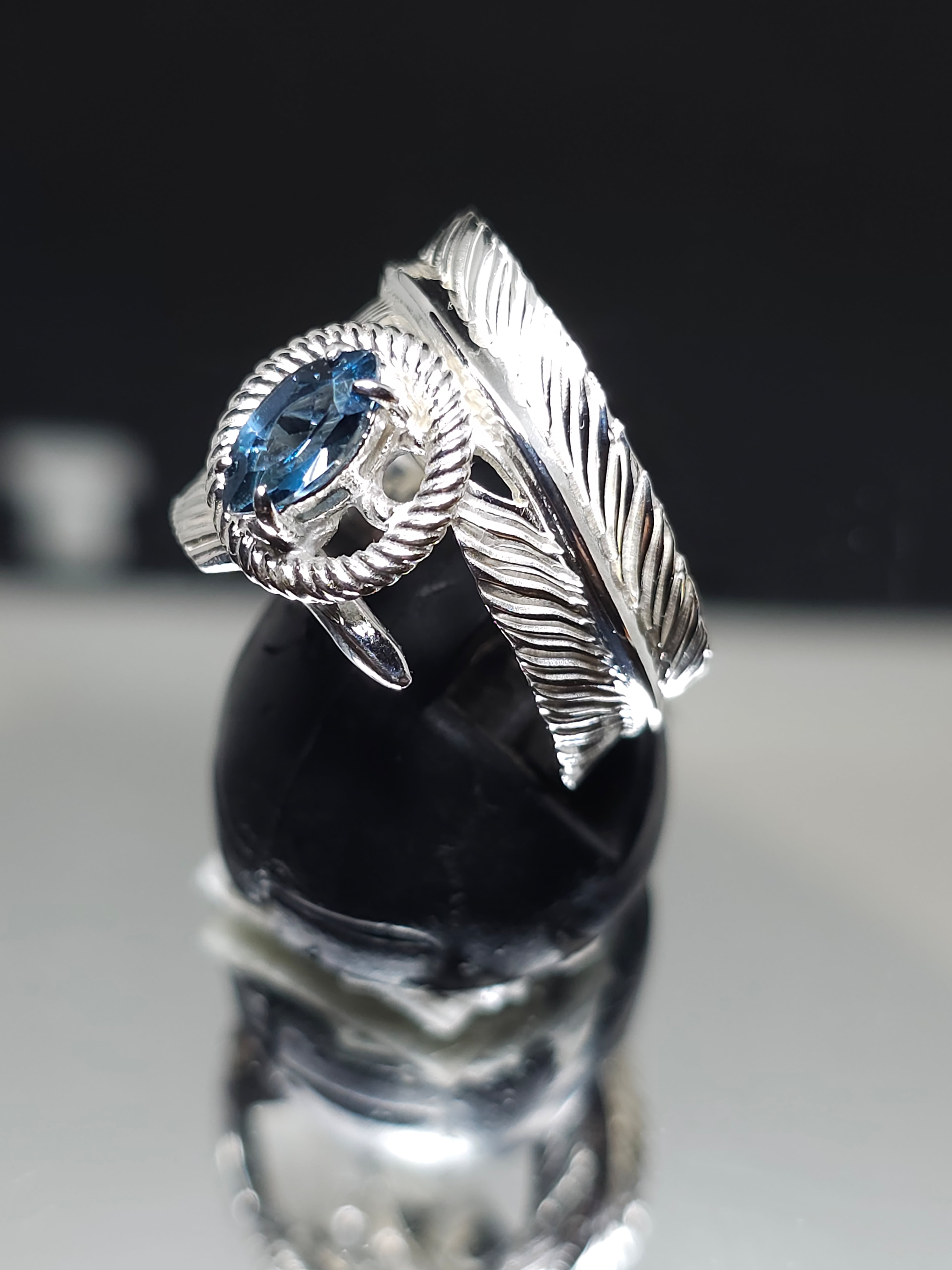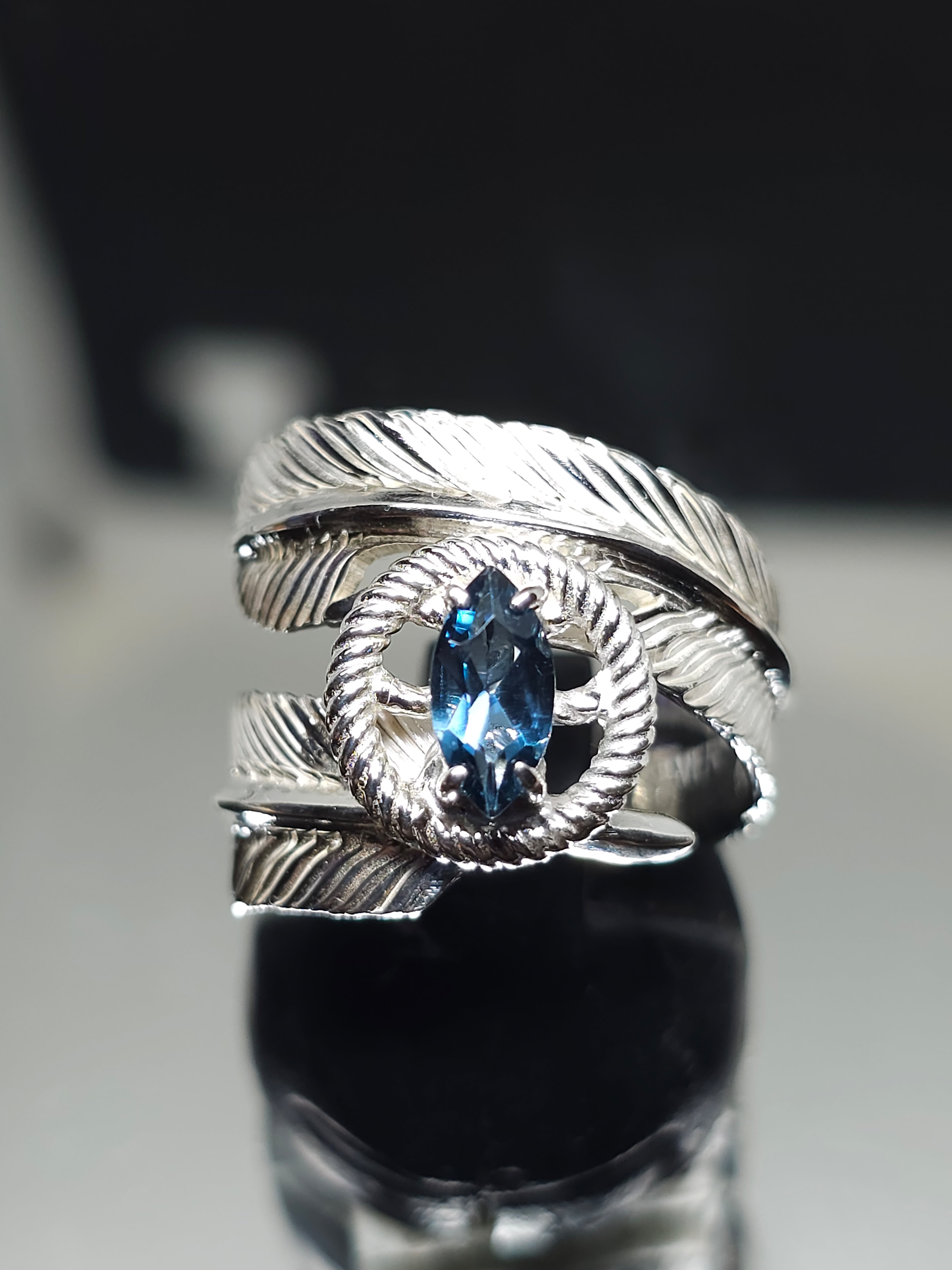 ロンドンブルートパーズのマーキスカット8×4mmを留めたフェザージュエリーリングです。