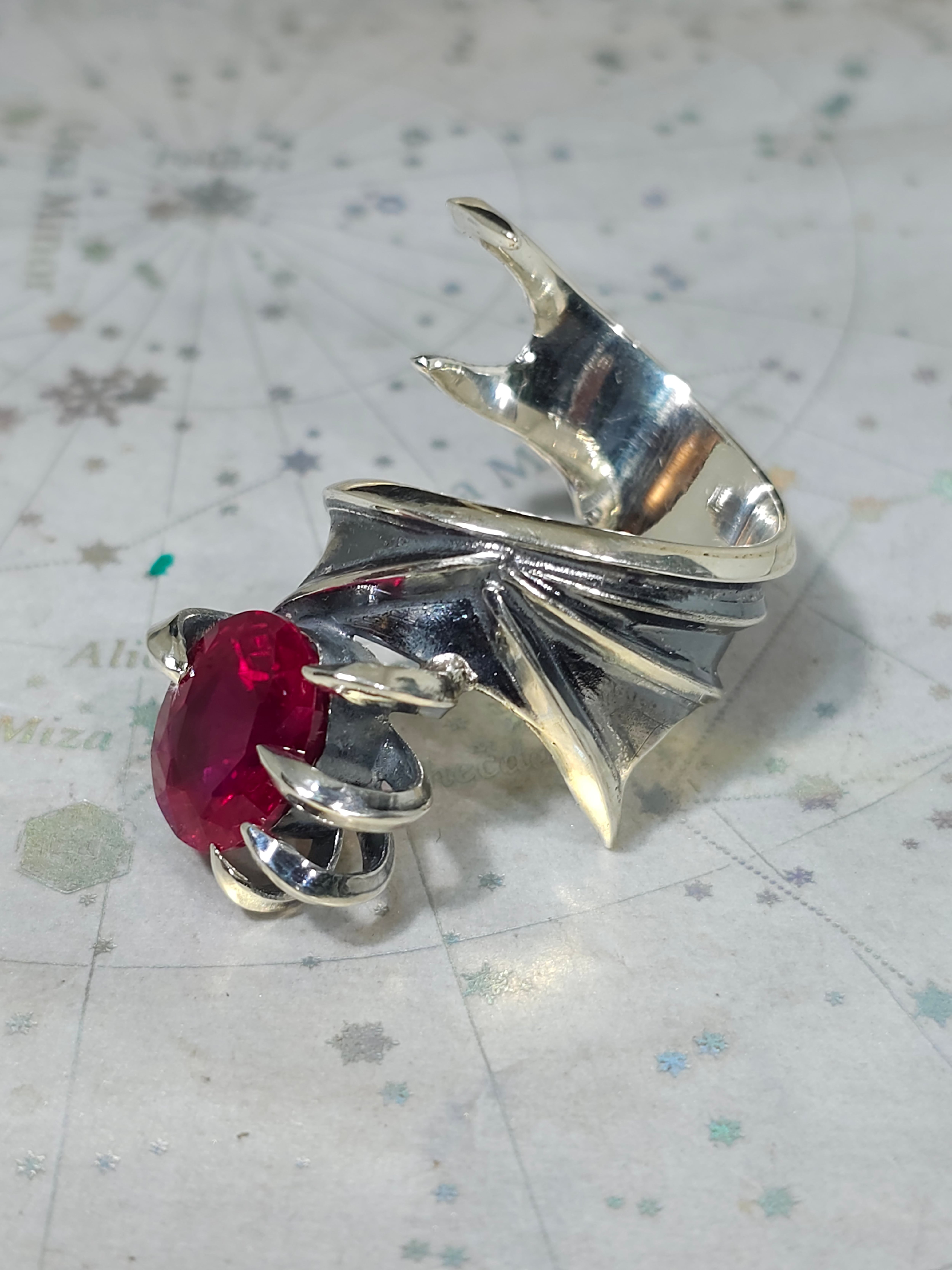 真紅の合成ルビーを握り締めた、悪魔の翼をモチーフにした中二心満載で製作した指輪です。
