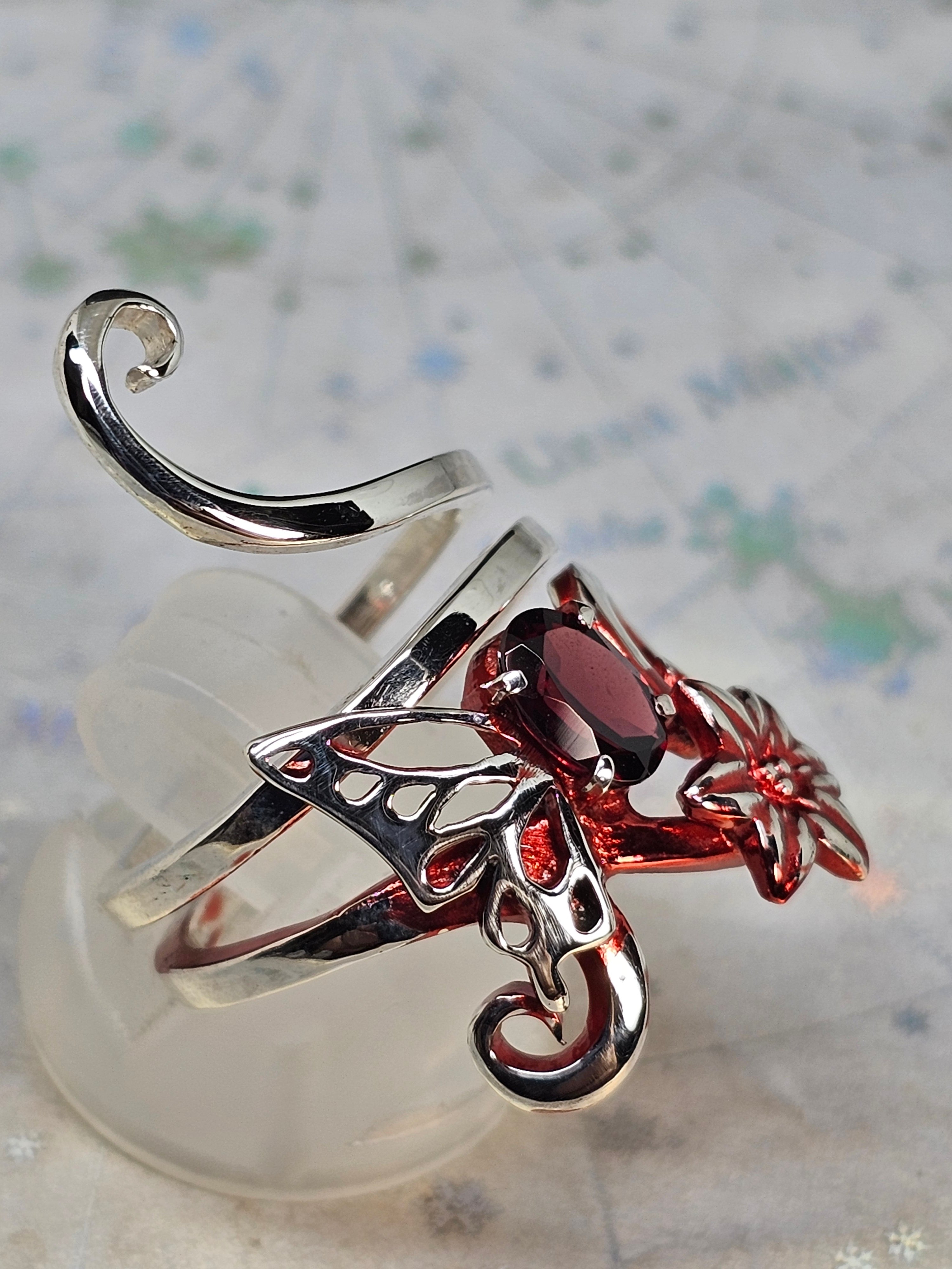 赤百合と片翅蝶のクルクルクルリング インド産ロードライトガーネット7×5mm
