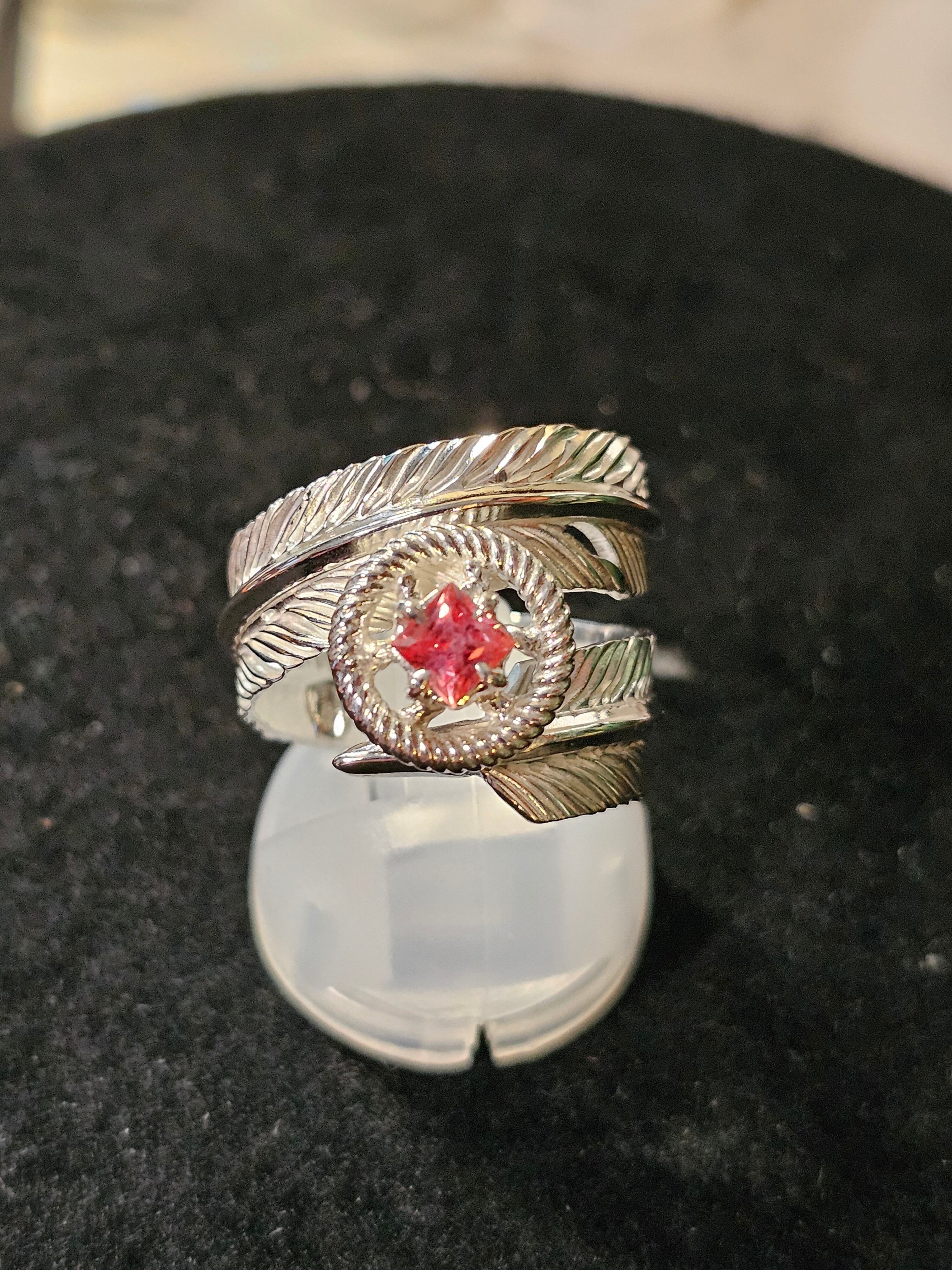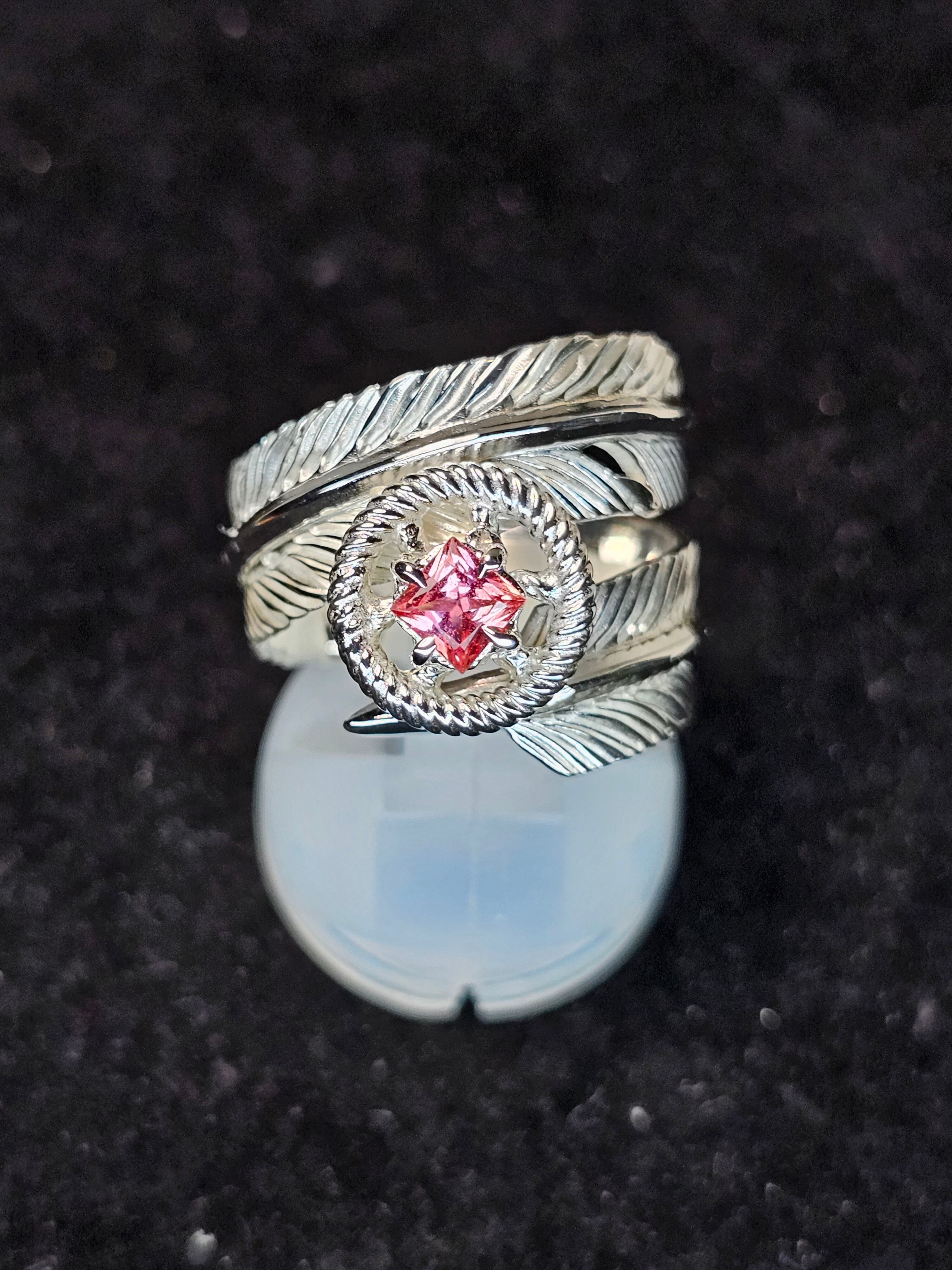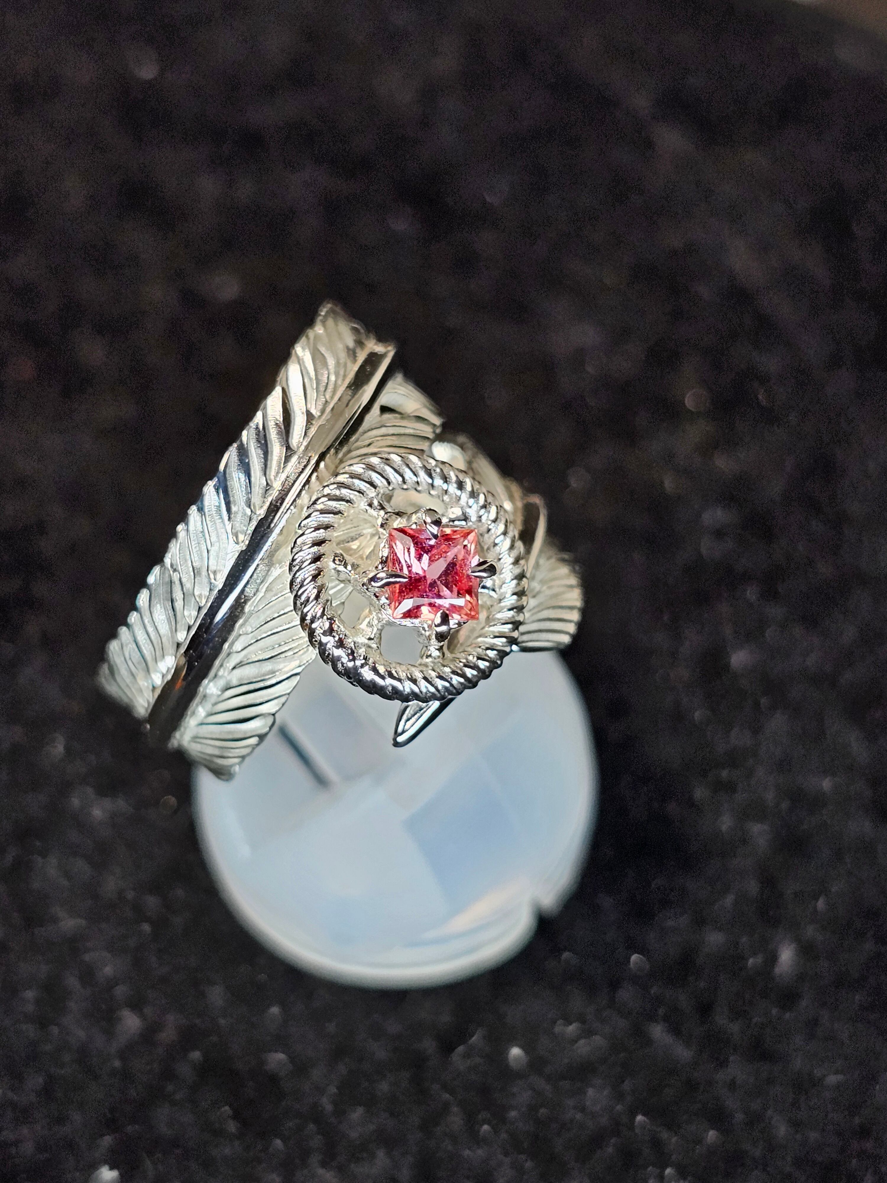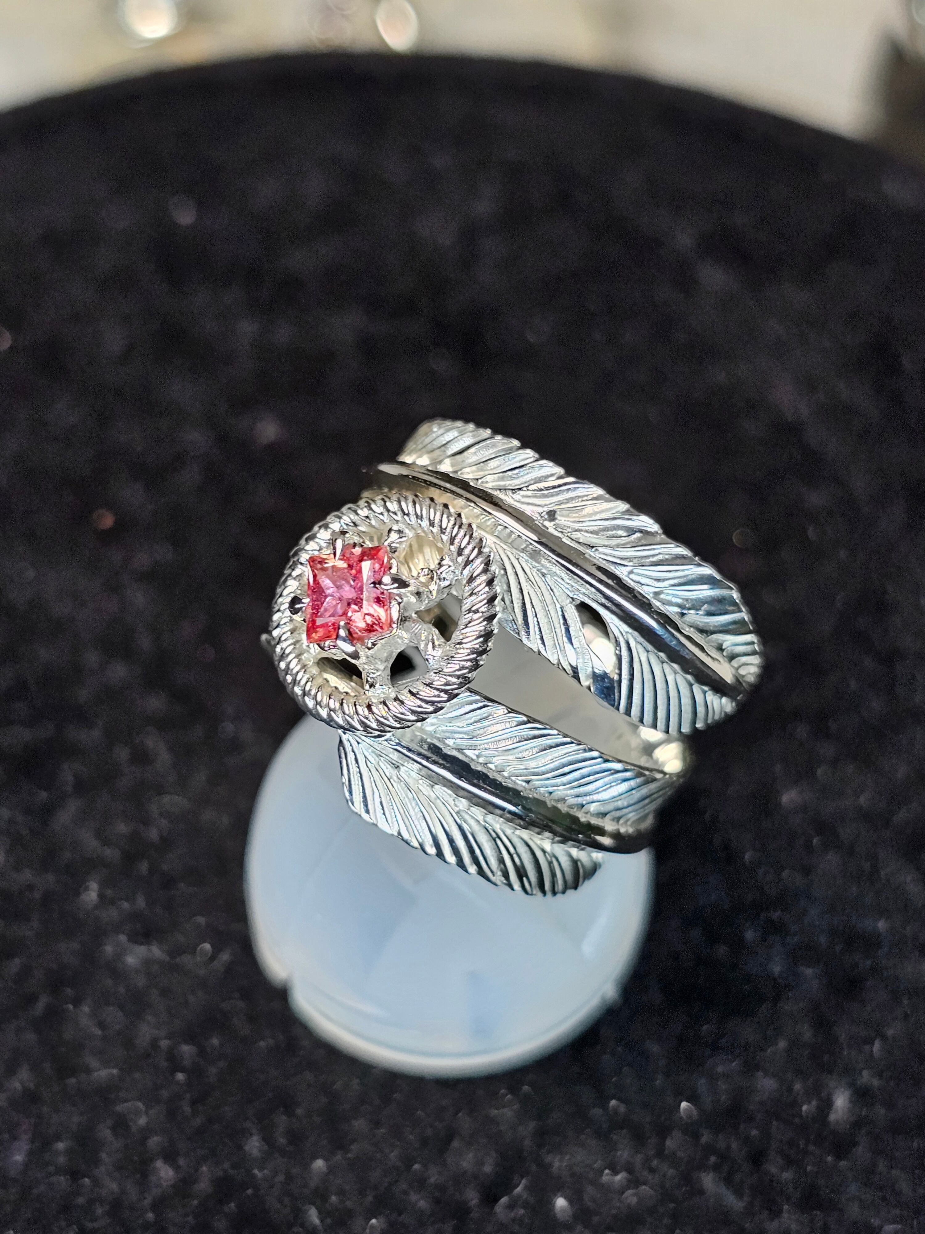 ベリリウム拡散加熱処理サファイアを留めたフェザージュエリーリングです。
