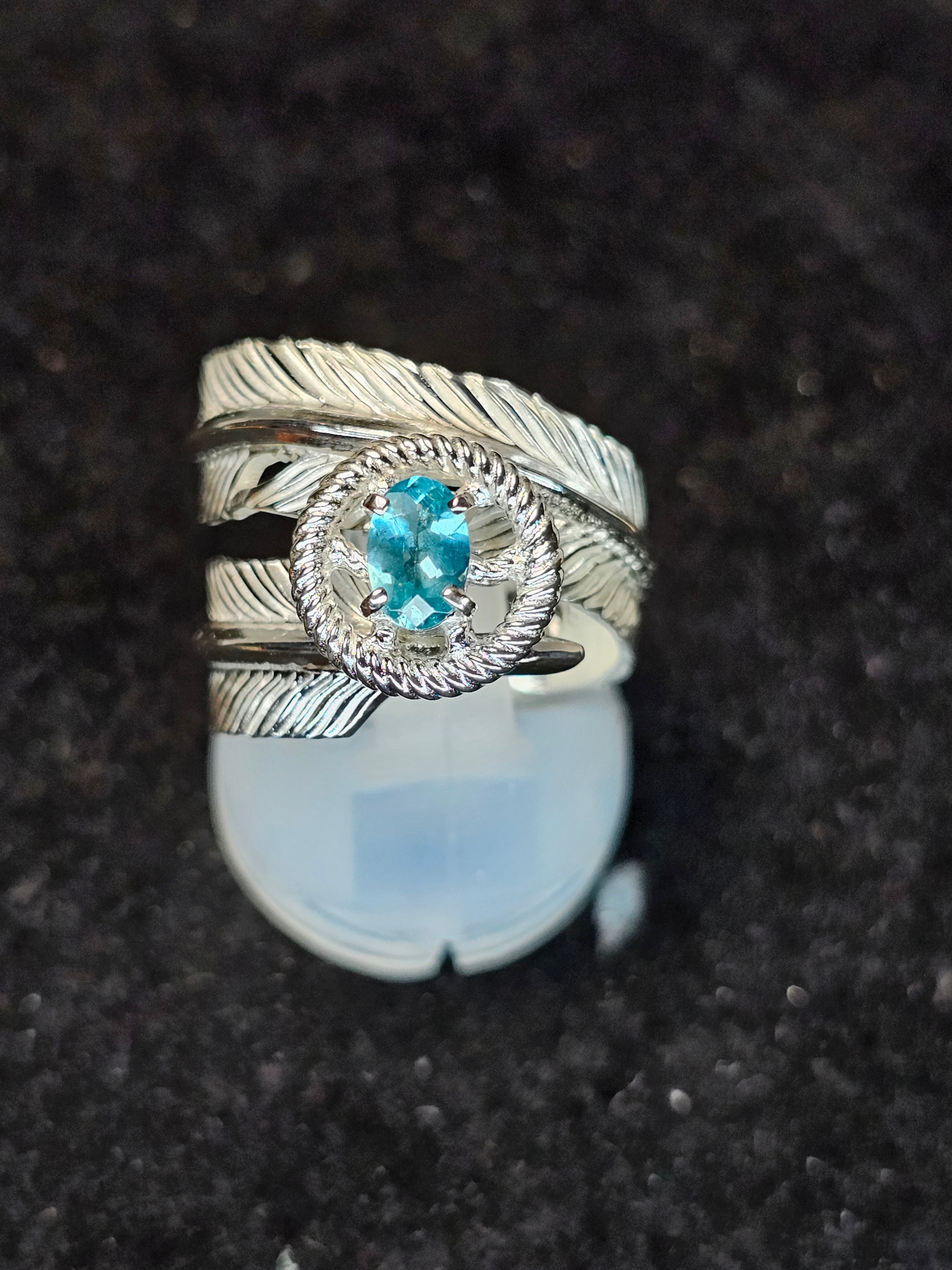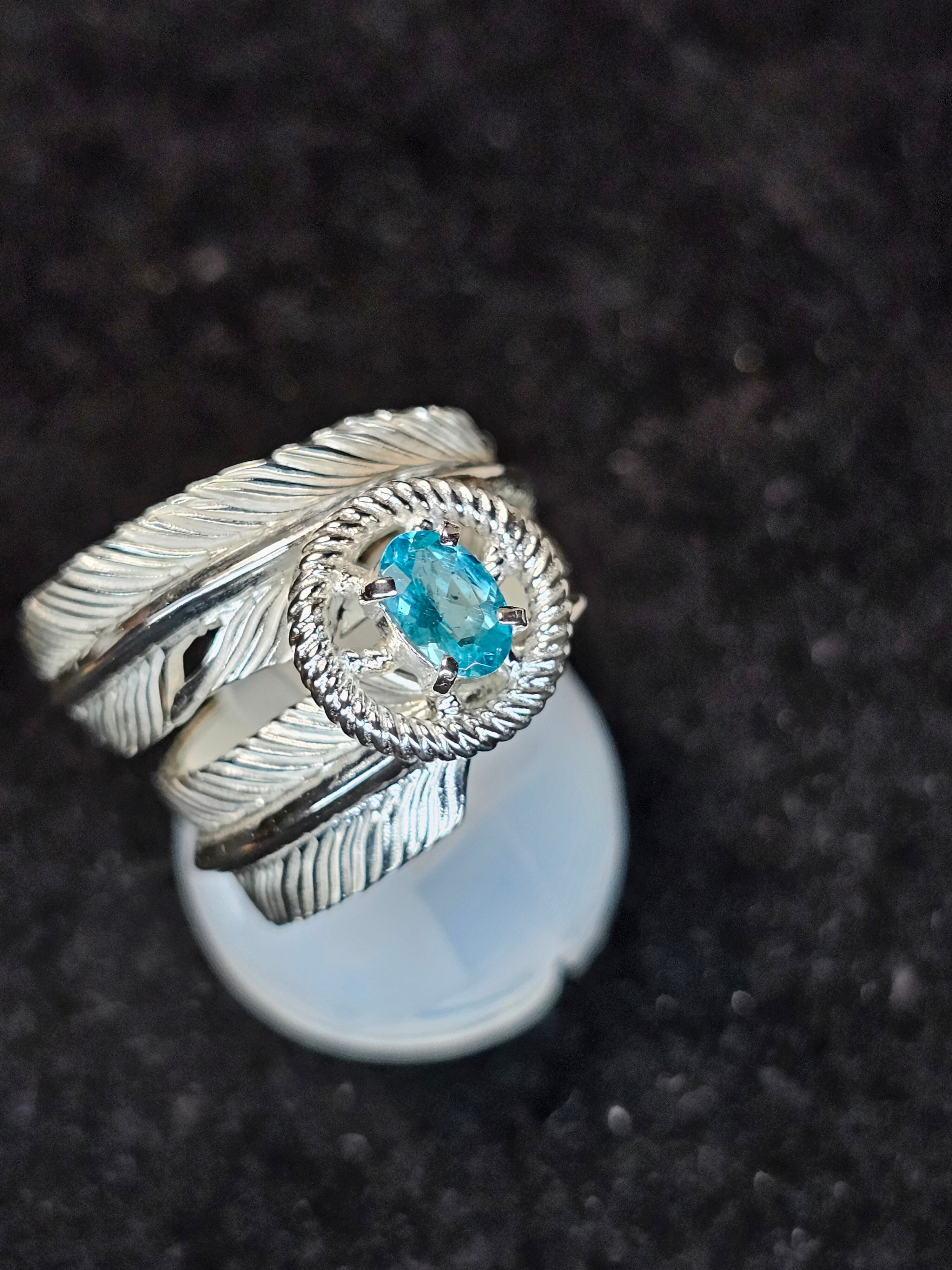 鮮やかな碧色の天然アパタイトを留めたフェザージュエリーリングです。